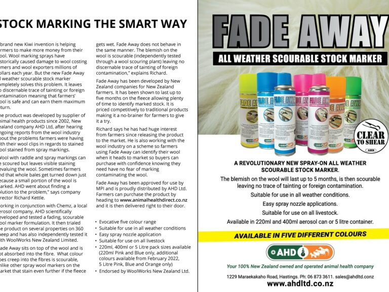 ✅ Proven On-Farm Results – Click here to see Fade Away in action – results from trial carried out on a NZ Farm from sheep being sprayed, shorn 3 months later then wool going to Wool Works.